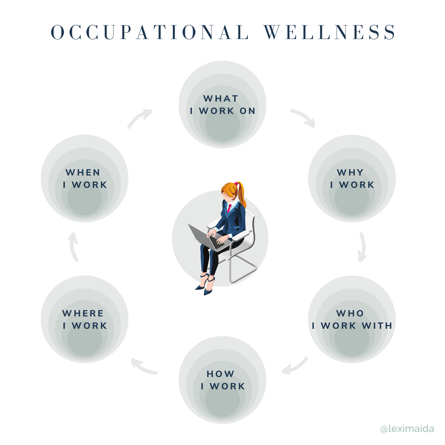 If I am seeking to work on my occupational wellness, I should attempt to begin with first principle thinking about how my work connects to my foundational value system. Occupational wellness connects why I work, who I work with, where I work, how I work, when I work, and what I work on back to an overarching goal of wellness. So, if that’s the case, I should consider what defines these details through the lens of my value system and let that be the foundation to how I proceed toward action.